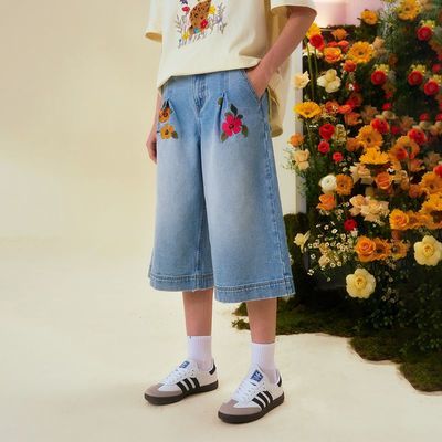 百亿补贴:SuaMoment花朵刺绣牛仔七分裤男女夏宽松复古休闲情侣阔腿裤短裤