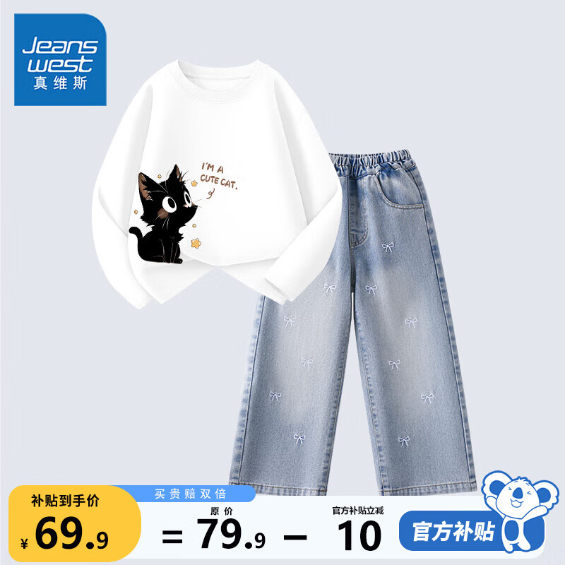 百亿补贴:真维斯女童套装春秋儿童长袖t恤纯棉打底衫阔腿牛仔裤大童秋装女孩童装 白 黑色猫咪_7+浅蓝 150