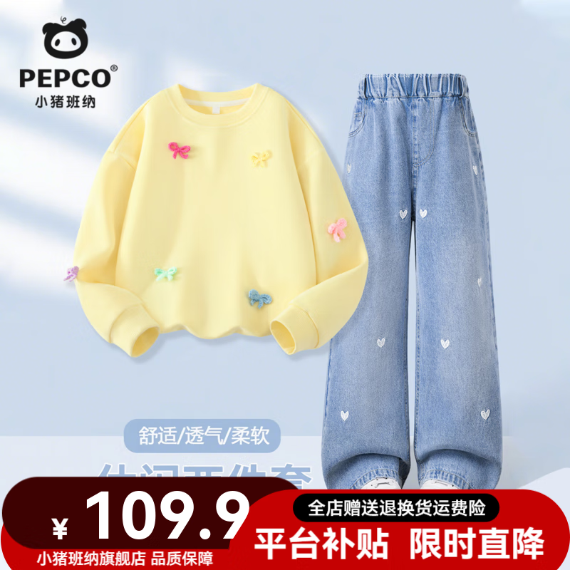 百亿补贴:小猪班纳女童套装春秋季女孩童装休闲洋气柔软卫衣亲肤耐磨牛仔裤儿童衣服 【蝴蝶结卫衣+爱心刺绣牛仔裤】01 120 【推荐37-45斤】