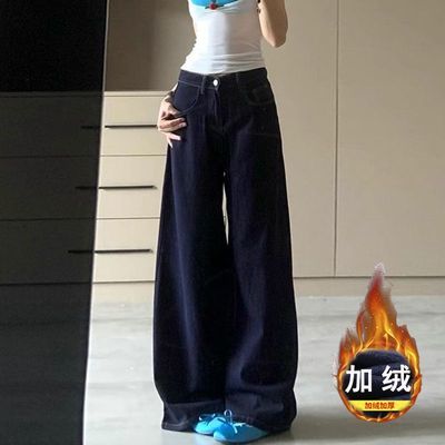 百亿补贴:美式深蓝色阔腿牛仔裤女秋冬加绒高腰百搭宽松显瘦垂感拖地直筒裤