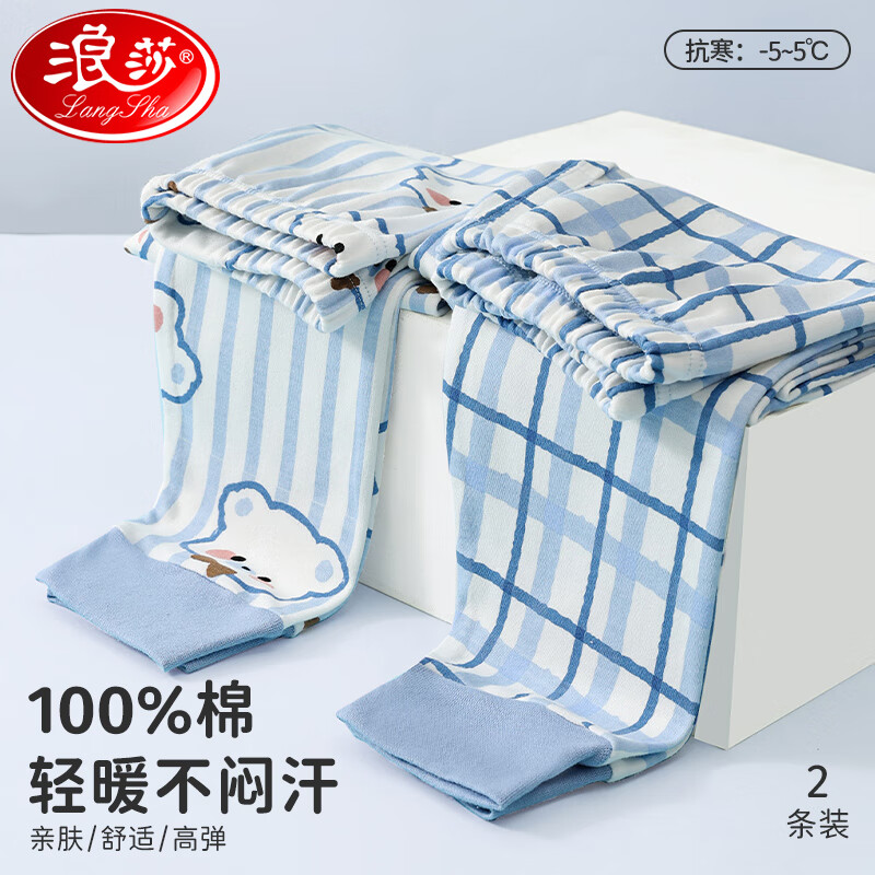 浪莎儿童秋裤男女童保暖睡裤秋冬季中大童学生纯棉打底裤2条装 海蓝色 120cm