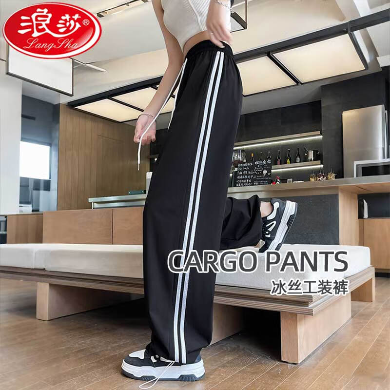 浪莎条纹工装裤女2025夏季新款小个子速干休闲裤宽松运动裤冰丝阔腿裤 黑色 S 【推荐80-95斤】