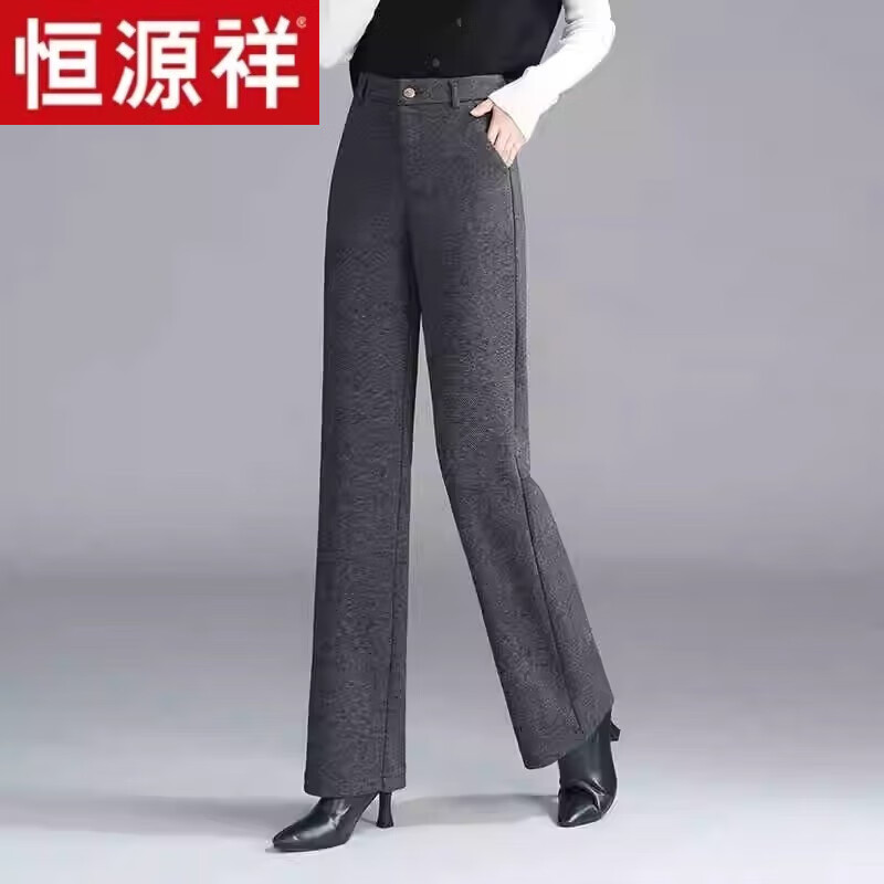 恒源祥(HYX)毛呢阔腿裤女秋冬加绒加厚2025新款高腰垂感人字纹休闲西装直筒裤 黑灰色春秋款 XL 29码 115-125斤