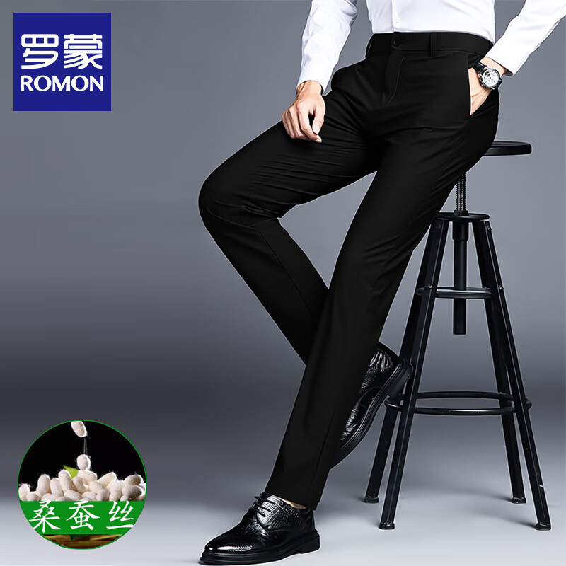 罗蒙(ROMON)【桑蚕丝】高端男士休闲西裤夏季垂感通勤商务西装裤子 黑色 32