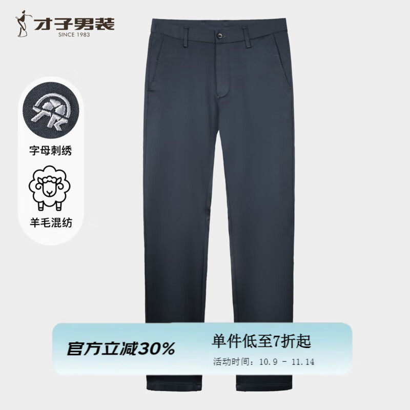 才子(TRIES)商务休闲裤男25年春季新款弹力修身直筒裤羊毛混纺刺绣西装裤 灰蓝色 32 82cm