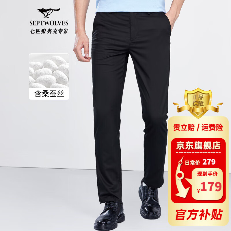 七匹狼【可机洗羊毛弹力西裤】男士直筒长裤春夏商务休闲直筒正装裤子 001(黑色)1D1E50401252-含羊毛 28
