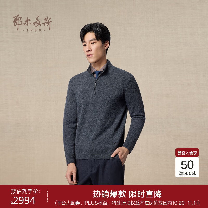 鄂尔多斯1980半高领拉链双提厚款男装休闲羊绒衫秋冬 碳灰 L 175/96A