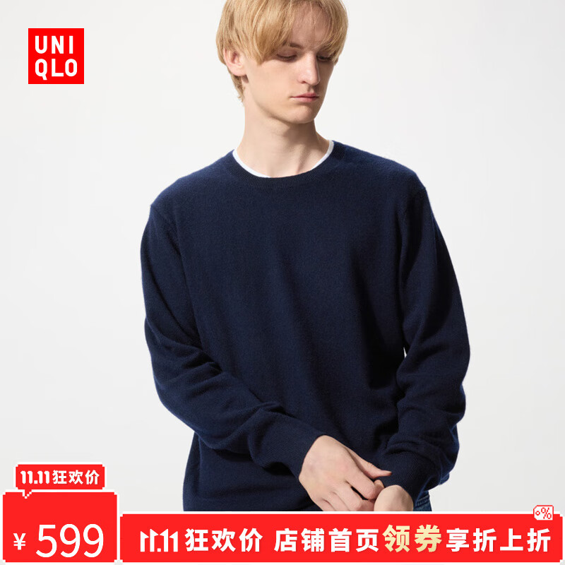 优衣库【惊喜价】男装女装羊绒圆领针织衫/长袖毛衣毛衫478543 69 藏青色 L