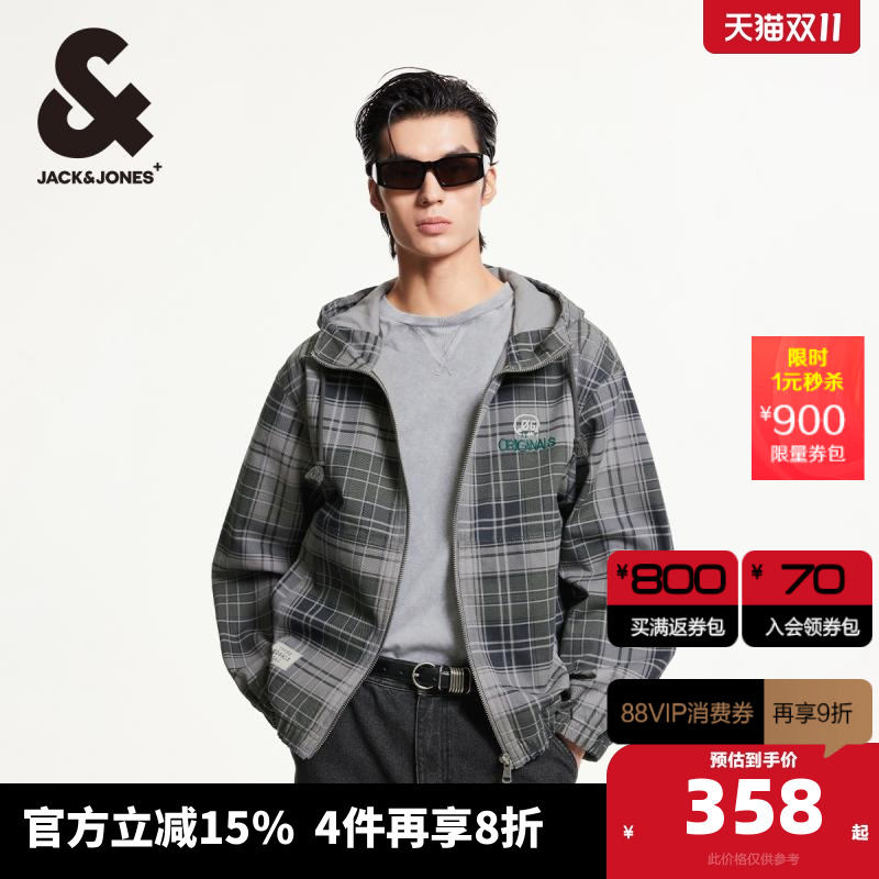 E61葱绿色 170/92A/S 杰克琼斯男装夹克 外套春季新款舒适刺绣格纹抽绳连帽宽松男装