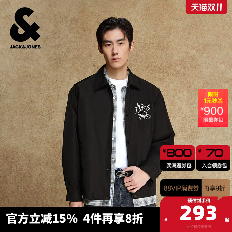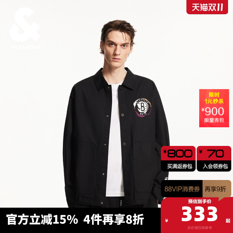 E43纯黑色 165/88A/XS 杰克琼斯outletsNBA联名款夏新款翻领刺绣工装长袖夹克外套男装