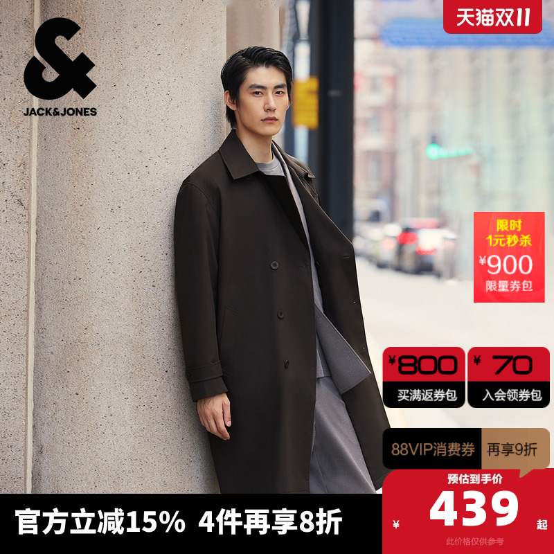 E09巧克力棕色 165/88A/XS 杰克琼斯奥特莱斯夹克男装秋季双排扣门襟可拆卸腰带长款外套上衣