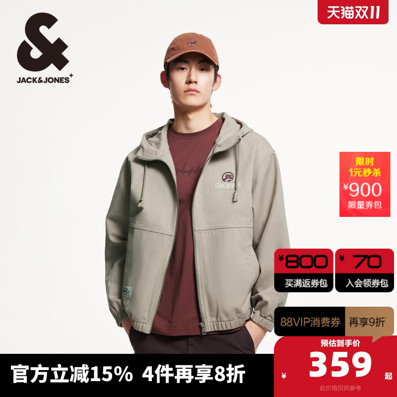 E11卡其色 170/92A/S 杰克琼斯男装夹克 外套春季百搭休闲宽松抽绳连帽刺绣开衫男装