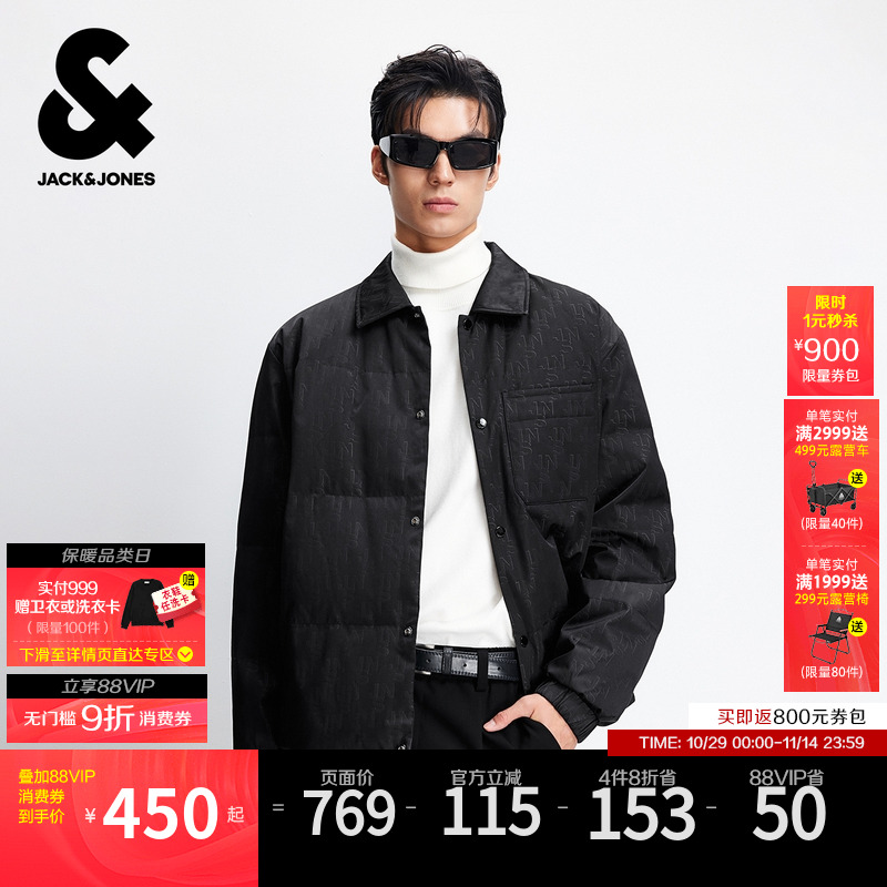 E40黑色 165/88A/XS 【轻薄羽绒服】杰克琼斯冬季提花时尚日常衬衫式夹克外套上衣男装