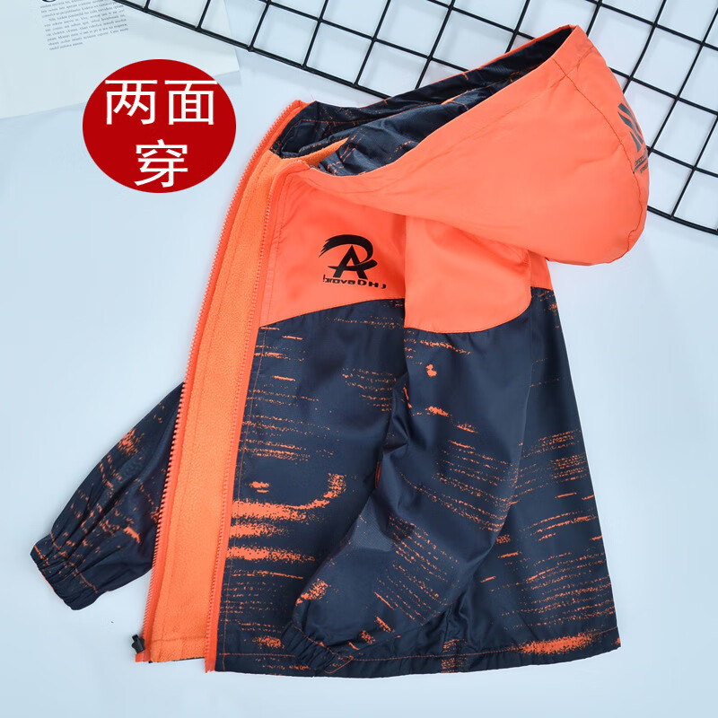 温小影男童外套春秋2025男孩户外冲锋衣儿童加绒双面穿中大童夹克衫潮流 泼墨橘色 150 cm