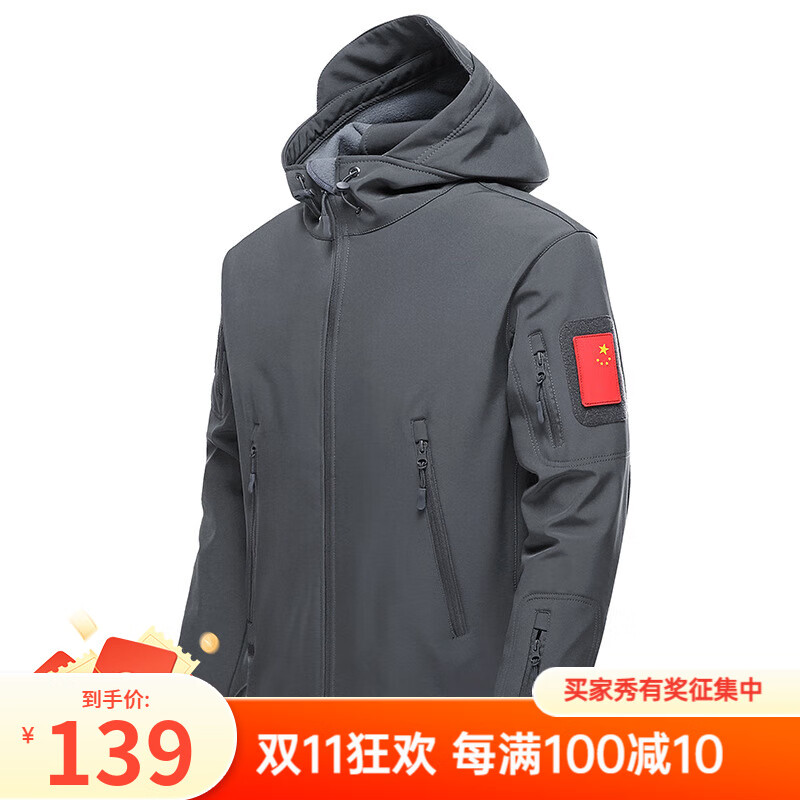 德尔.默克(Delmerk)软壳衣抓绒单层冲锋夹克上衣男女防风防水保暖魔术贴冲锋骑行服 灰色(单层加绒秋冬款) 2XL