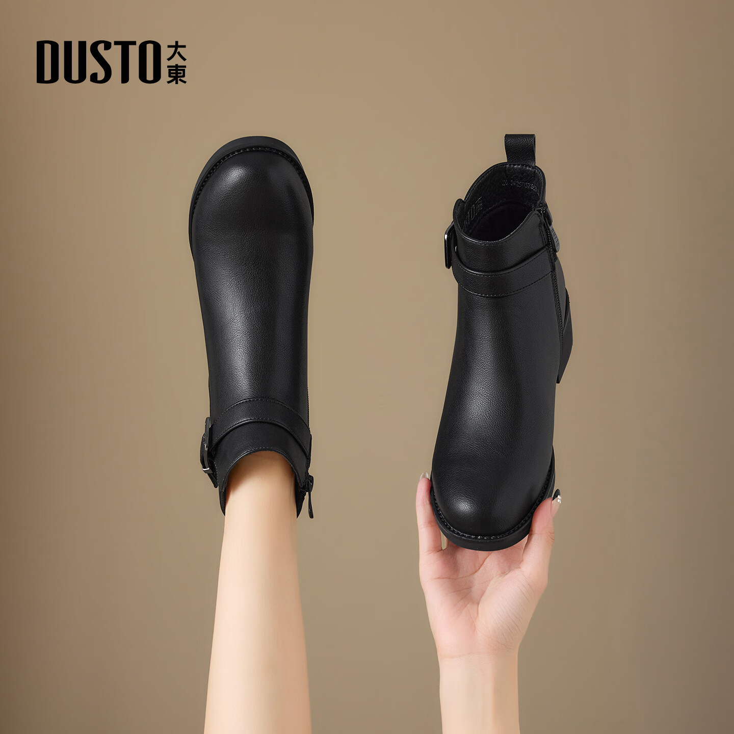 dusto大东时装靴女鞋冬季新款粗跟中跟侧拉链圆头黑色金属扣冬靴3766 黑色 35