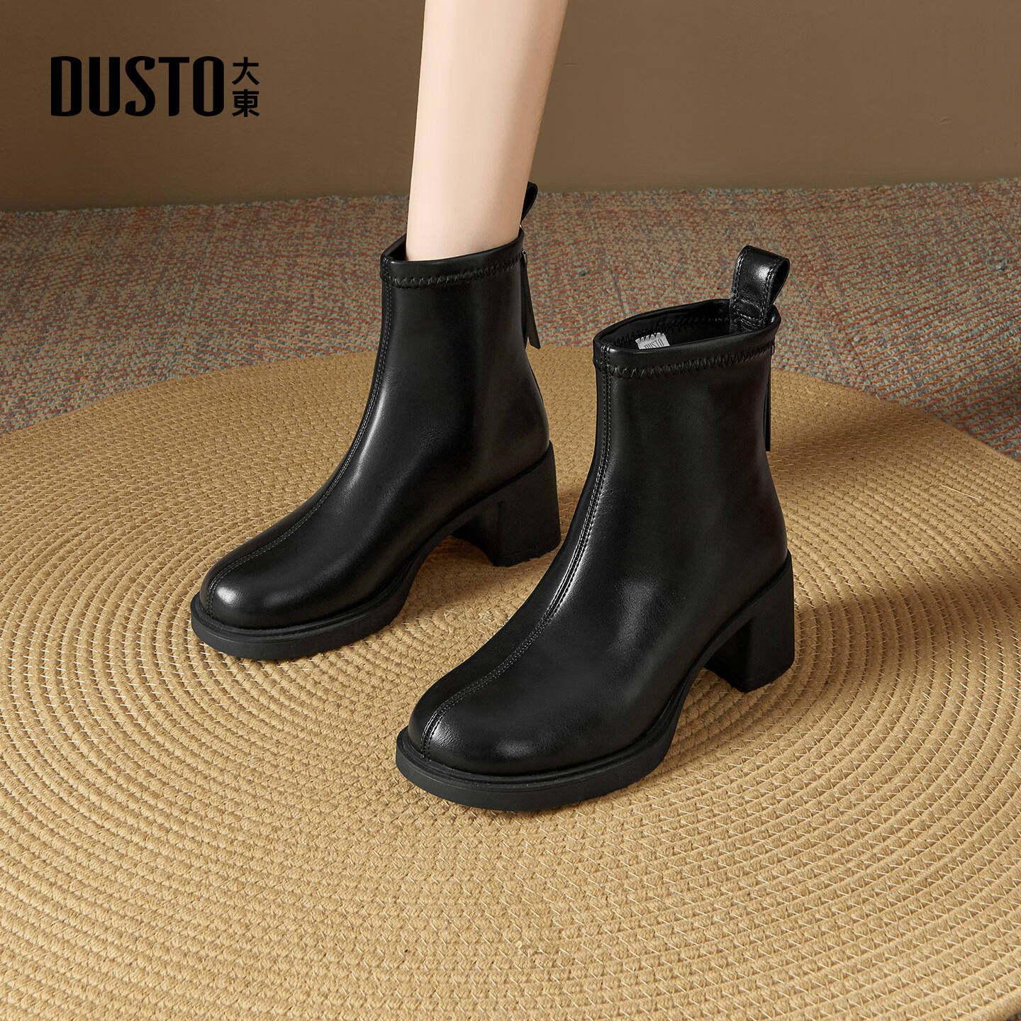 dusto大东时装靴女鞋冬季新款百搭粗跟高跟后拉链圆头光板1018 黑色 39