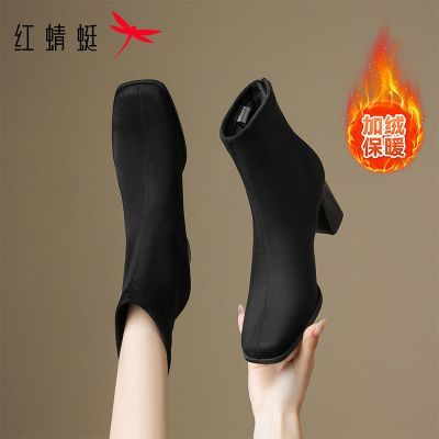 百亿补贴:红蜻蜓高跟短靴女靴子秋冬新款妈妈鞋粗跟皮鞋靴子气质弹力瘦瘦靴