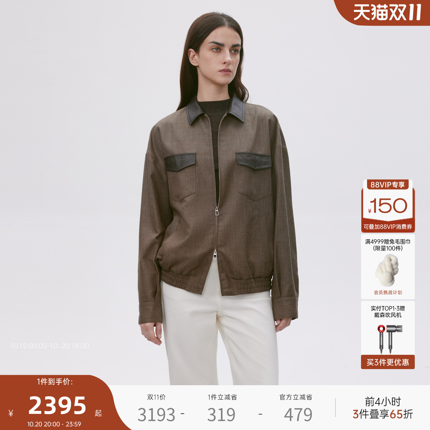 咖啡 S MISSCOCOON可可尼C3系列复古棕色混色羊毛翻领双袋工装夹克外套女