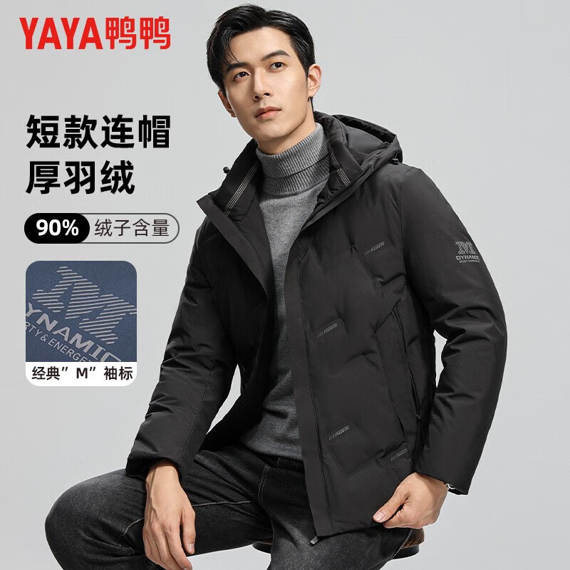 鸭鸭(YAYA)羽绒服男短款连帽立领厚款保暖青年冬季新款工装外套 黑色 XL 180 (建议125-140斤)