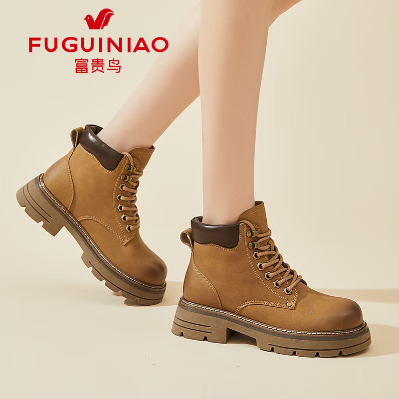 百亿补贴:富贵鸟马丁靴女2024秋冬季增高女靴户外登山靴复古工装靴加绒厚底短靴 驼色 FN0244/1750-2 36