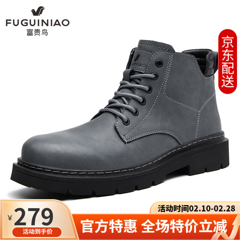 富贵鸟男鞋春季高帮休闲皮鞋男士英伦风马丁靴男时尚圆头厚底工装鞋子男 灰色 42