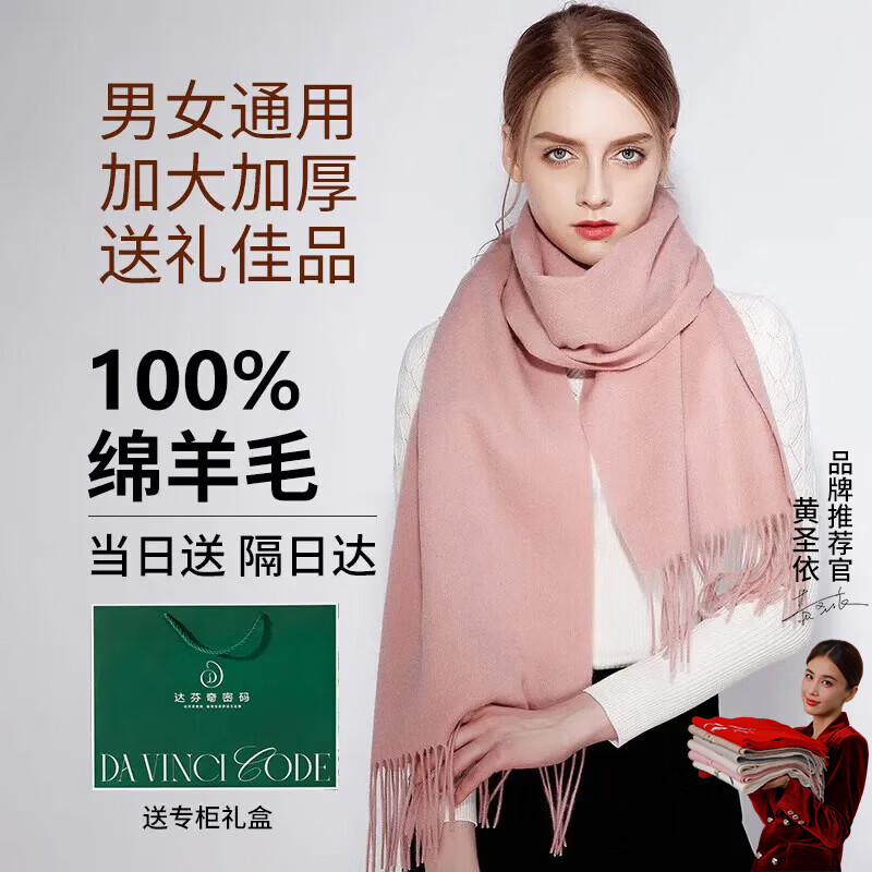 百亿补贴:达芬奇密码100%羊毛围巾男女士红色秋冬款围脖本命年礼物披肩 粉色
