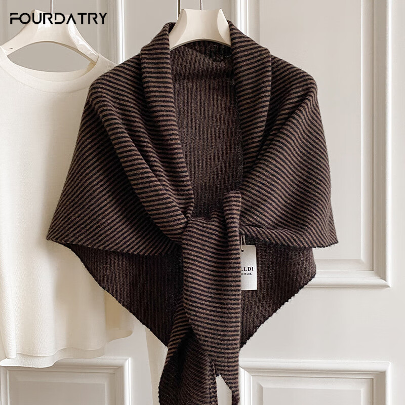 FOURDATRY100%纯羊毛条纹披肩外搭女2025新款秋冬韩系三角针织叠穿气质坎肩 咖黑条纹