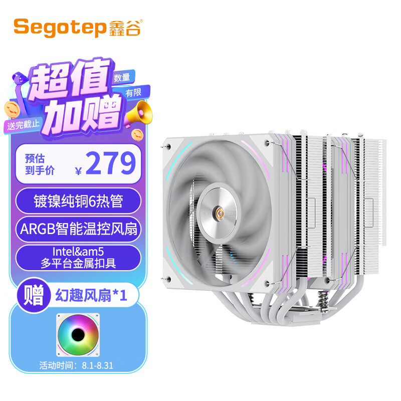 鑫谷(segotep)昆仑MU HT6白色双塔风冷CPU散热器(镀镍纯铜6热管/ARGB智能温控/Intel/AMD/AM4多平台金属扣具)