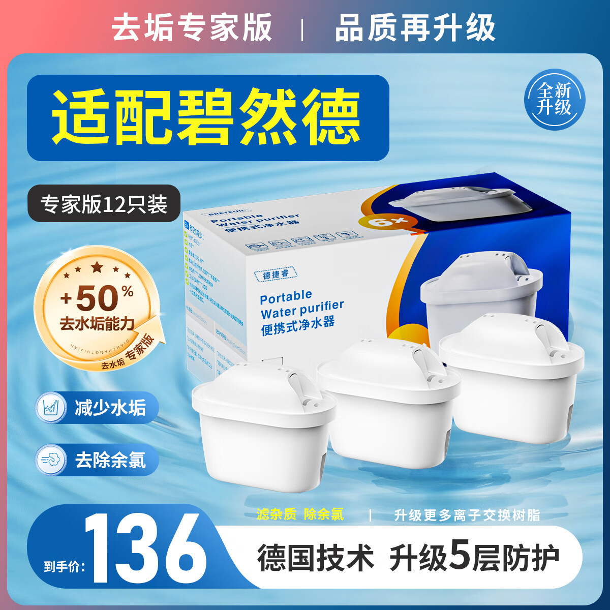 德捷睿家用净水器滤芯碧然德滤芯过滤器滤水壶净水壶滤芯通用三代专家版加强去垢 【适配碧然德】12支三代专家版