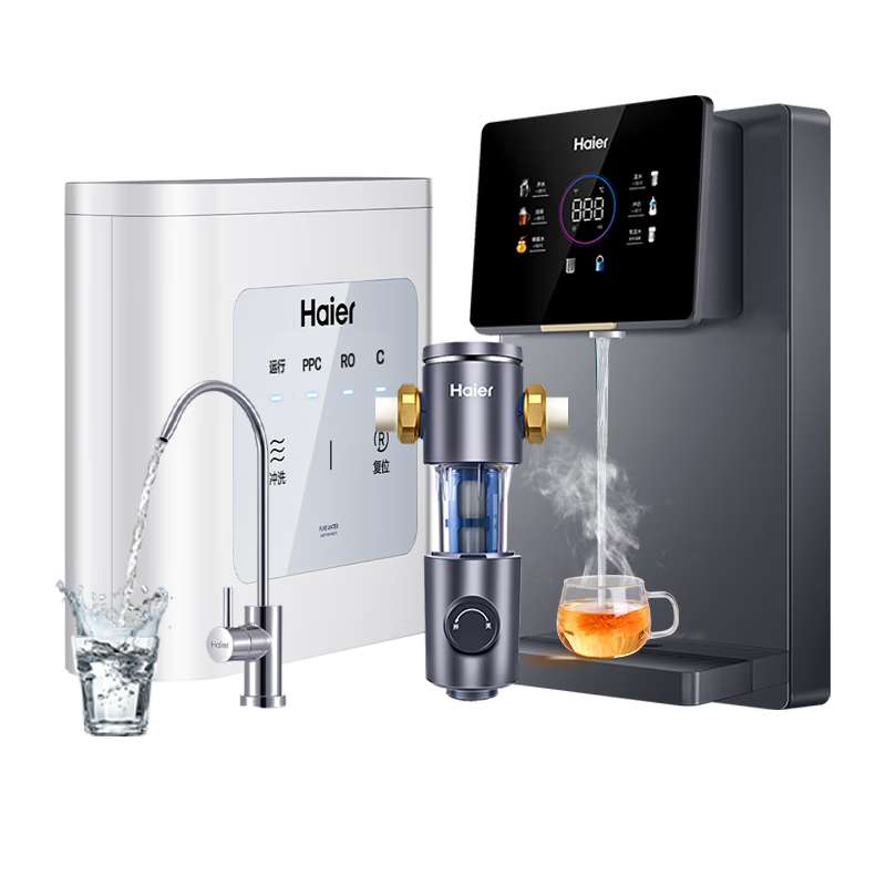 百亿补贴:海尔(Haier)净水器家用厨下母婴RO反渗透直饮净水机加热一体机餐边柜壁挂式管线机接自来水全屋前置过滤器套装 高端彩屏管线机+顶配前置+净水器