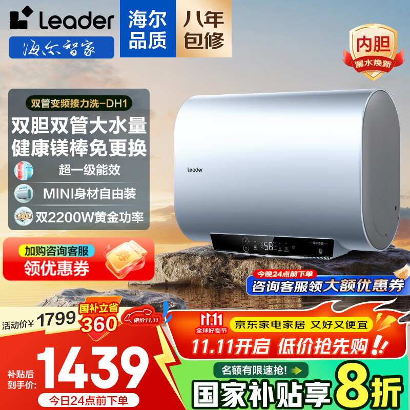 海尔(Haier)政府补贴20%双胆电热水器超薄扁桶60升3.3KW双管变频速热小尺寸家用一级能效 净水洗储水式电热 60L 2200W 【双管变频接力洗】DH1小尺寸