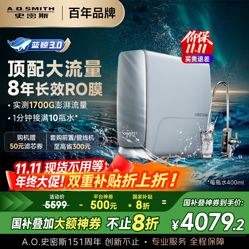 史密斯(A.O.SMITH)佳尼特蓝鲸净水机家用净水器直饮机一体机厨下8年RO膜京东自营实测1700GCR4000AE1国家补贴