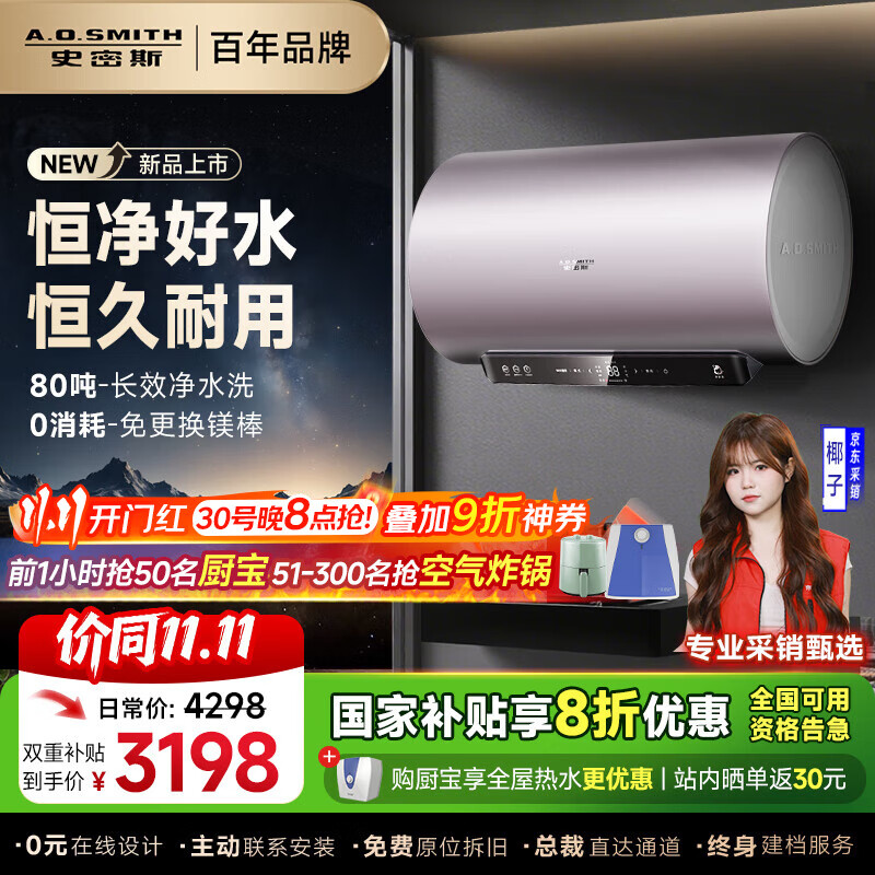 史密斯(A.O.SMITH)【国家补贴20%不限区域】电热水器60升80升免换镁棒长效净水双3kW速热储水式家用洗澡一级能效ED8 60L 3000W 【纤长款】双3kW分层速热