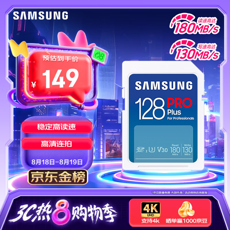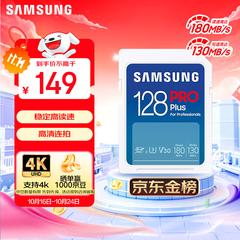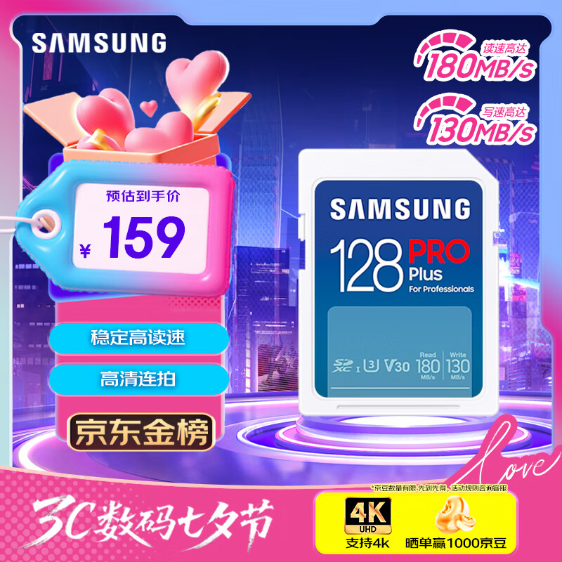 三星(SAMSUNG)128GB SD存储卡 高速PRO蓝卡 U3SD相机内存卡支持微单/单反相机4K视频 读速180MB/s写速130MB/s