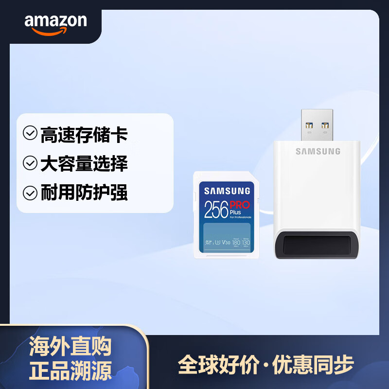 SAMSUNG 三星 PRO Plus 256GB内存卡+读卡器套装 高速PRO蓝卡 SD存储卡 C10/U3/V30 适用微单/单反相机