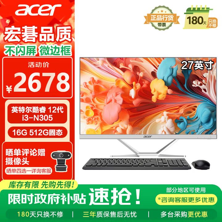 宏碁(acer)蜂鸟 27英寸 一体台式机电脑(酷睿 12代 i3-N305 16G 512G SSD)不闪屏办公 国家补贴20%