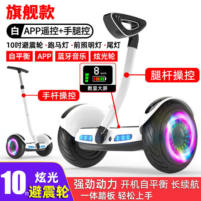 领盟自营电动智能平衡车两轮手扶越野腿控新款双轮平行车儿童成年人旗舰白【三控+APP+避震+炫光轮】
