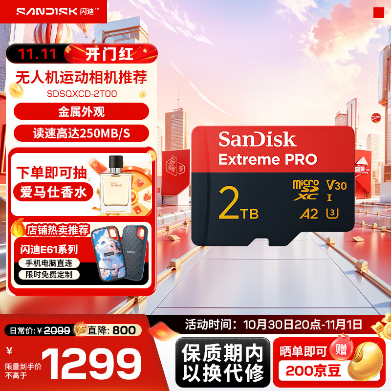 闪迪(SanDisk)TF卡 行车记录仪内存卡gopro相机无人机4K视频拍摄存储卡 至尊超极速 2T 读取250M/S 写入150M/S