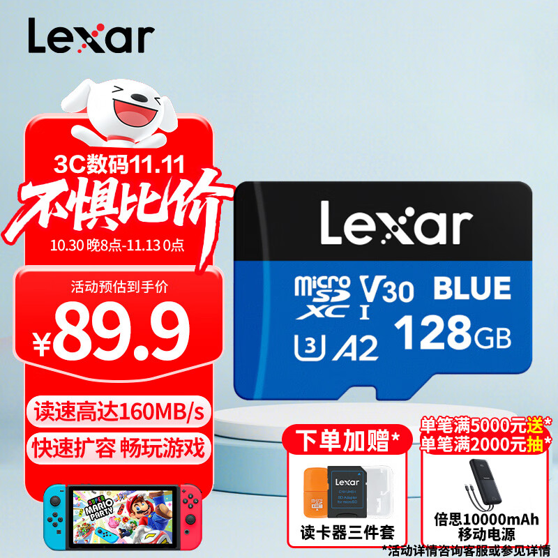 雷克沙(Lexar)TF卡 4K运动相机大疆无人机内存卡gopro手机存储卡MicroSD卡监控行车记录仪高速卡 128G blue卡 送读卡器三件套 TF卡