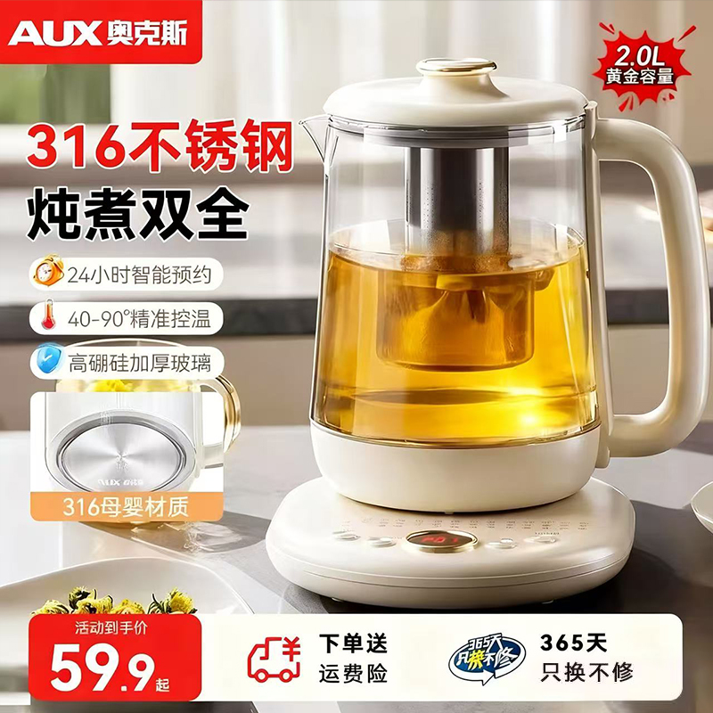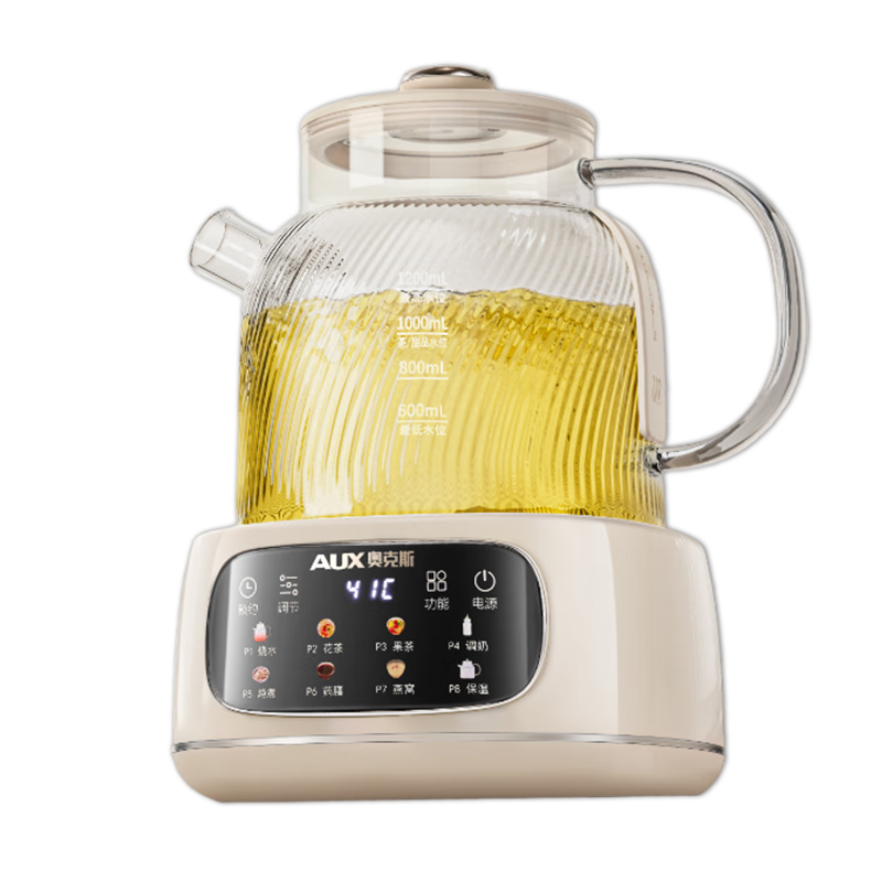 奥克斯(AUX)养生壶玻璃壶体全自动调奶器办公室多功能花茶壶恒温壶电热水壶煮茶壶YSW142 304不锈钢底盘