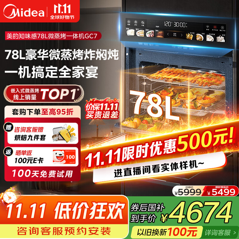 美的(Midea)【78L一步到位】嵌入式大容量微蒸烤一体机 纯平全嵌杯水鲜蒸 蒸烤箱一体机微蒸烤炸炖5合1体机GC7
