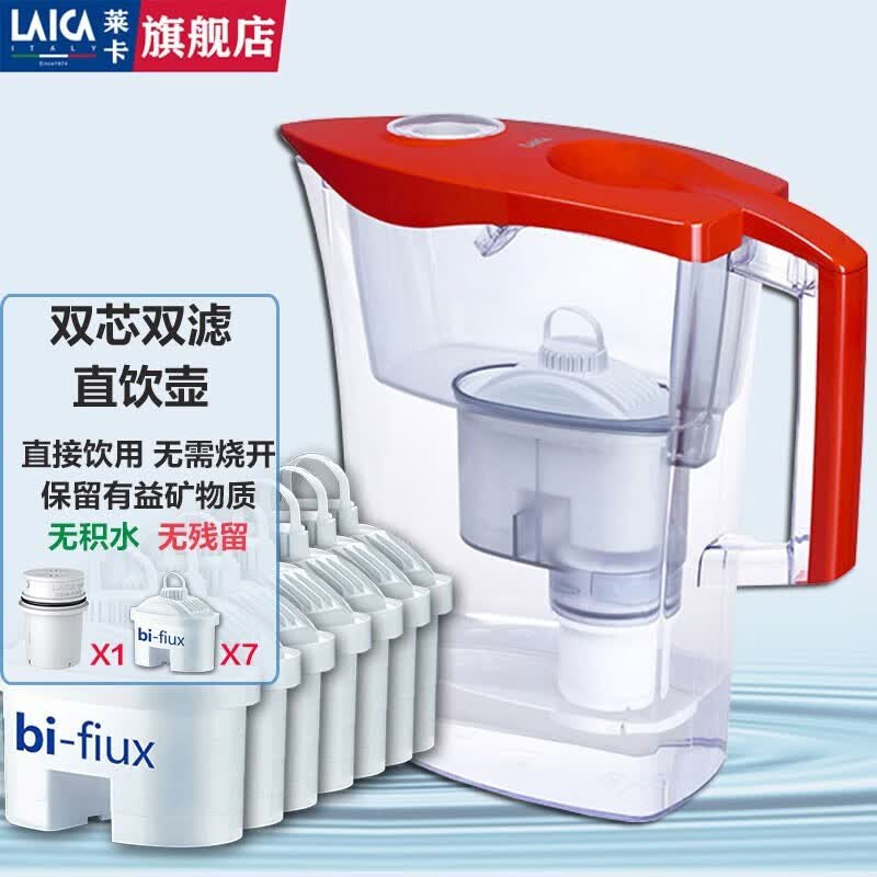 莱卡(LAICA)意大利净水壶 家用直饮滤水壶 过滤净水器 自来水过滤器 3.1L大容量 红色/蓝色1壶8芯【过滤直饮】