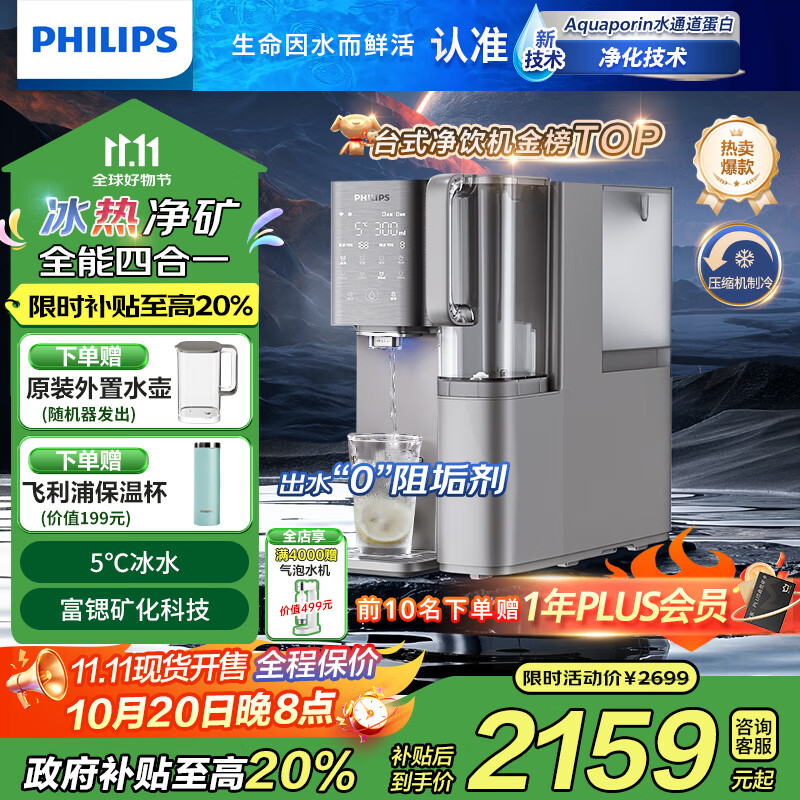 飞利浦(PHILIPS)净水器家用免安装净饮机冷热台式直饮机 富锶矿化冰热矿净四合一水通道蛋白膜 一级水效ADD6876 ADD6876【一级水效 冰热净矿】