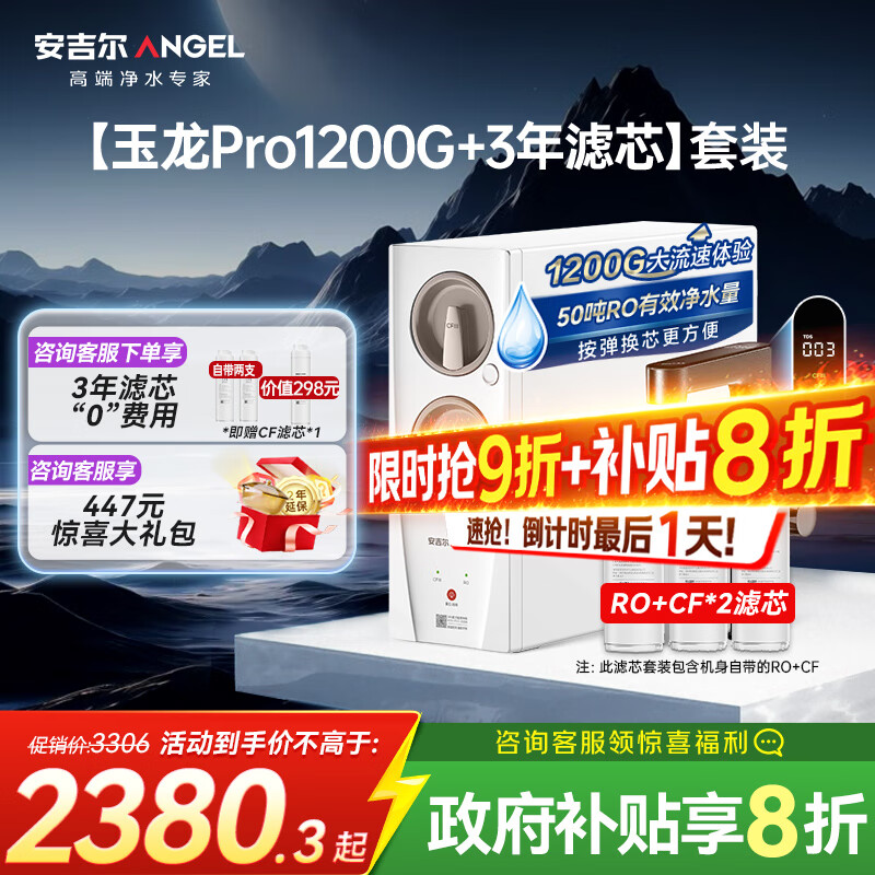 安吉尔家用净水器直饮净水机【玉龙Pro1200G+3年滤芯】套装纯水净饮机 5年长效RO膜反渗透厨下式过滤器