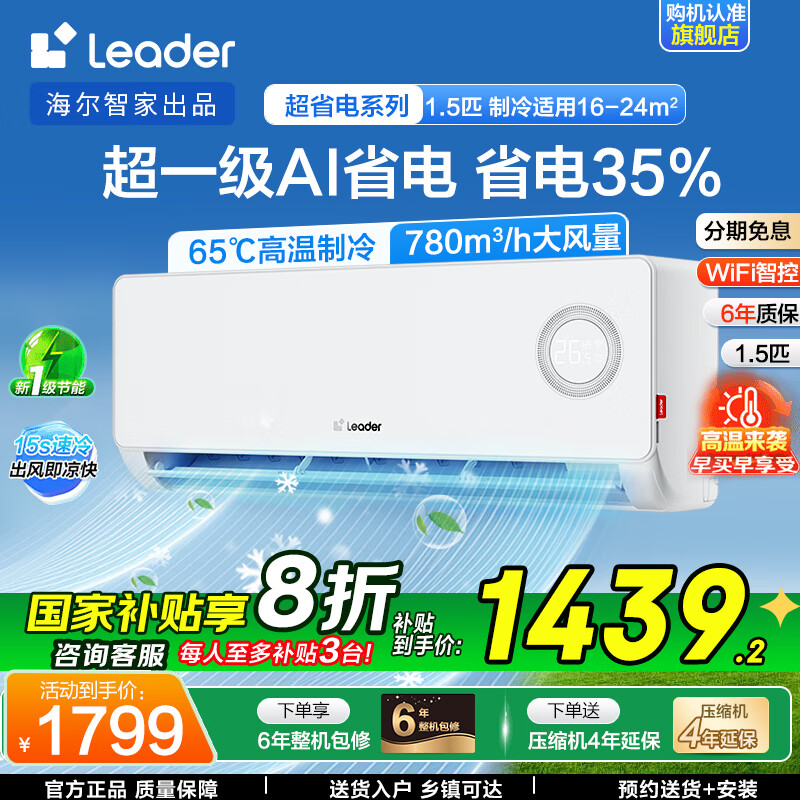 【政府补贴20%】海尔统帅空调超省电1.5匹一级能效冷暖家用挂机 Leader统帅 超省电 | 1.5匹 【性价比卷王