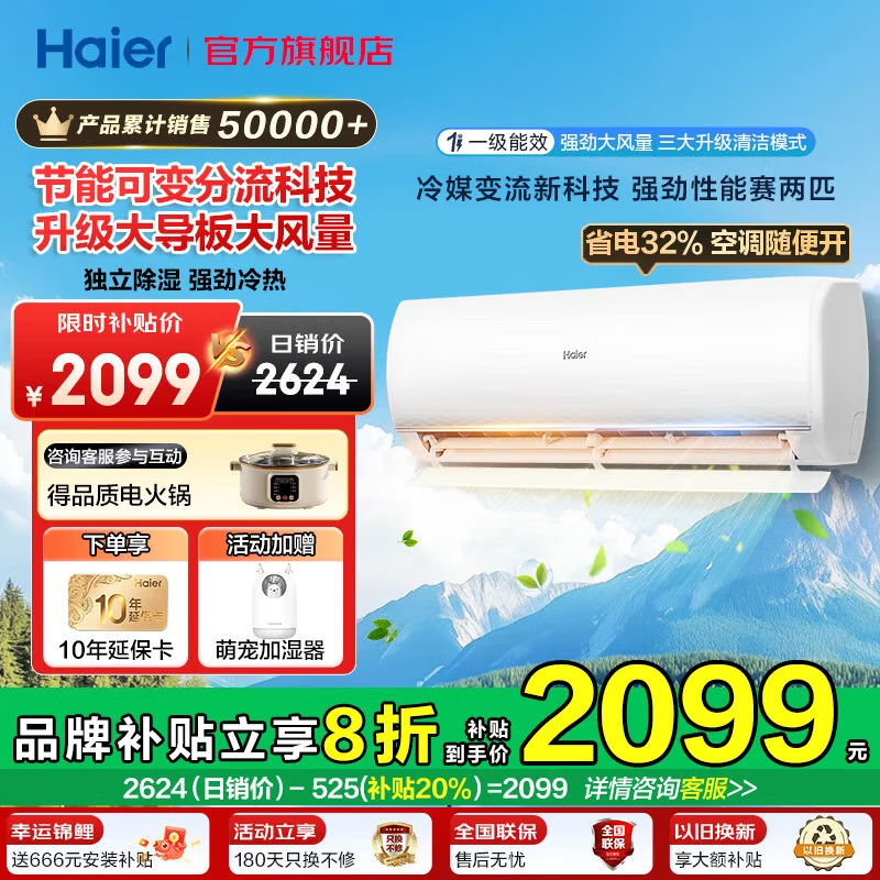 海尔(Haier)空调1.5匹强劲冷暖新一级能效节能变频家用卧室挂机 壁挂式独立除湿全屋智联升级大导板 以旧换新 1.5匹 一级能效 超省电+升级大风口+性价比卷王