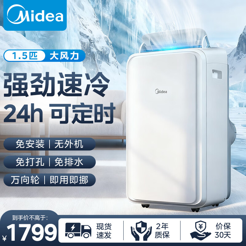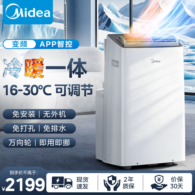美的移动空调制冷一体机1.5匹冷暖两用双管变频室内抽湿可移动无外机免安装立式智能空调 1.5匹
