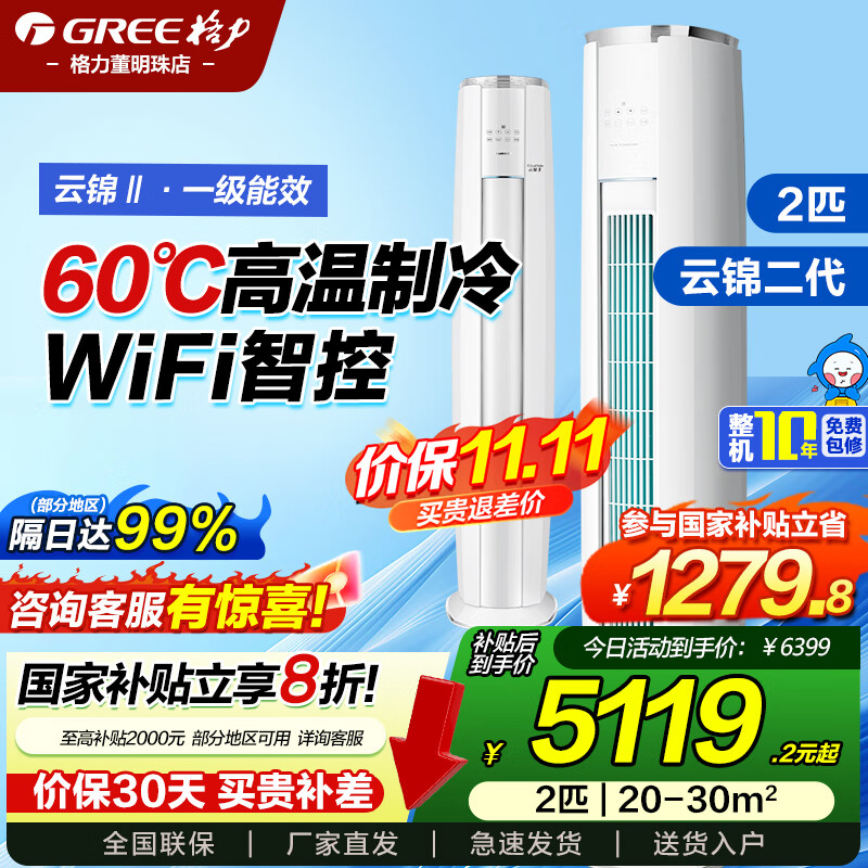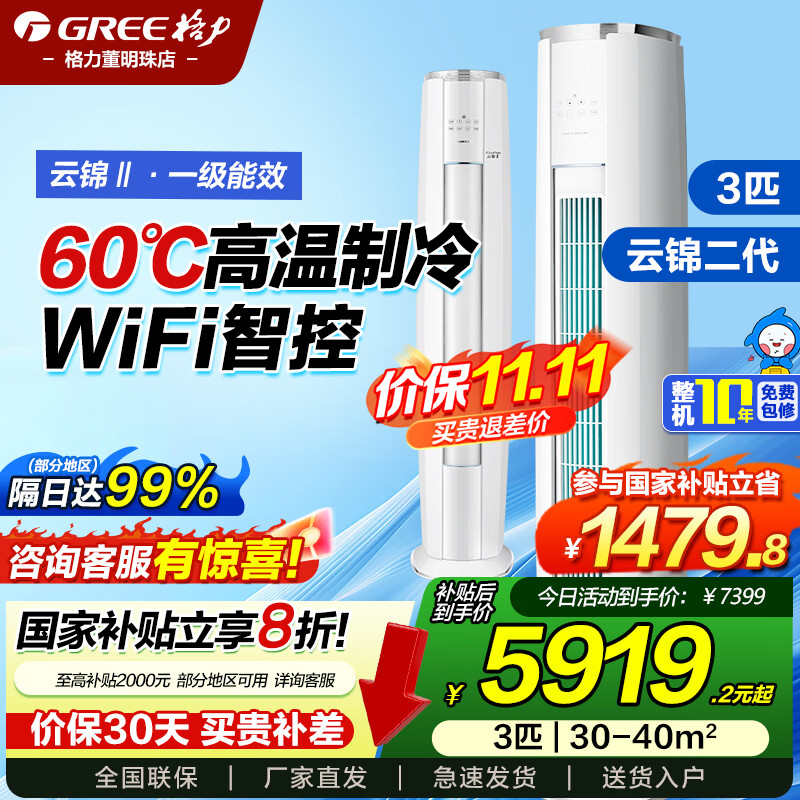 格力(GREE)空调3匹云锦三代/云锦pro【新品】新一级家用大客厅柜机变频冷暖圆柱立柜式国家补贴官方旗舰正品 2匹 一级能效 二代热销