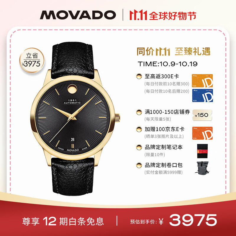 摩凡陀(Movado)瑞士手表全新1881腕表机械小牛皮男表0607455瑞表礼物送礼